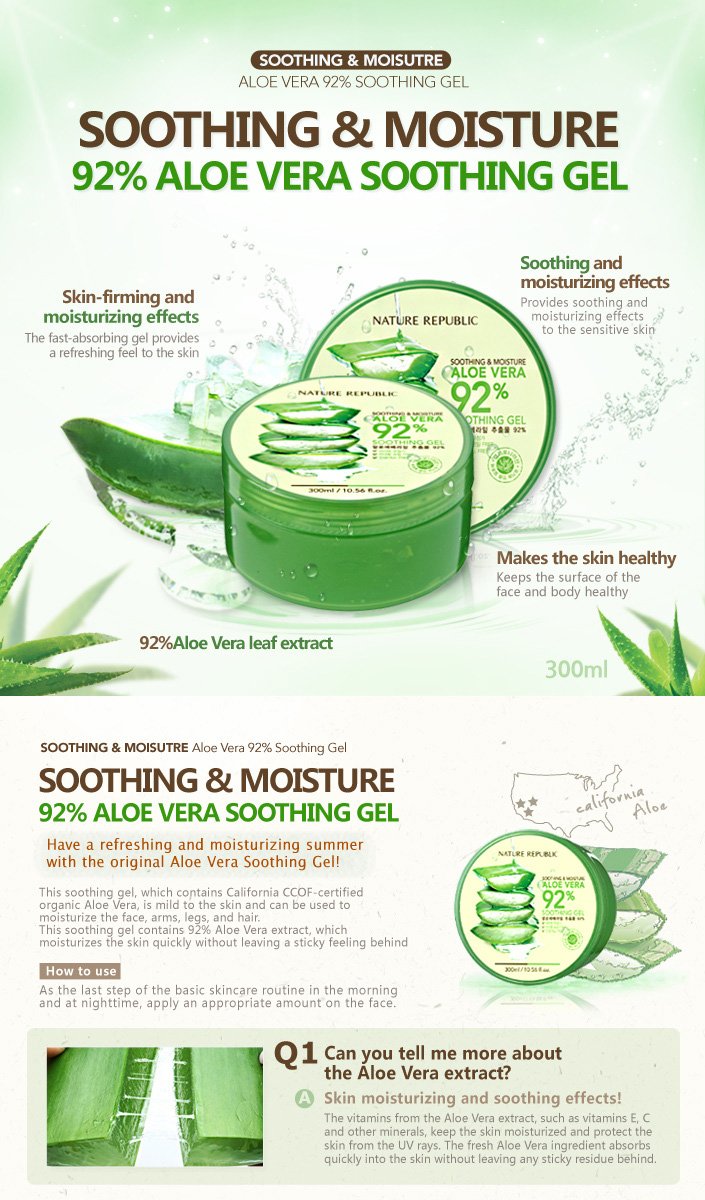 تمتعي بصيف منعش ورطب مع جل التنعيم بالألوفيرا الأصلي (ألوي فيرا) و الأكثر مبيعاً في العالم (30 مليون علبة). يحتوي على الألوفيرا العضوي المزروع في كاليفورنيا في الولايات المتحدة، لطيف على البشرة ويمكن استخدامه لترطيب الوجه والذراعين والقدمين والشعر. يتكون جل التنعيم و الترطيب على 92% من مستخلص الألوفيرا، والذي يعمل على ترطيب البشرة بسرعة دون أن يخلف شعوراً باللزوجة. تعمل الفيتامينات الموجودة في مستخلص الألوفيرا مثل فيتامين إي و سي والمعادن الأخرى على الحفاظ على بشرة رطبة وحمايتها من الأشعة فوق البنفسجية. ويعمل مكون الألوفيرا المنعش على التغلغل سريعاً في البشرة دون أن يخلف أي شعور باللزوجة.