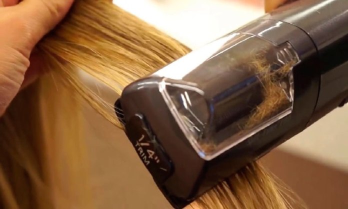 - تقسيم الخصل المسرحة إلى أقسام مناسبة الحجم، وتمريرها في الجهاز، والذي سيعمل على قص الشعيرات القصيرة والمتقّصفة باستخدام الشفرات الصغيرة الموجودة فيه.